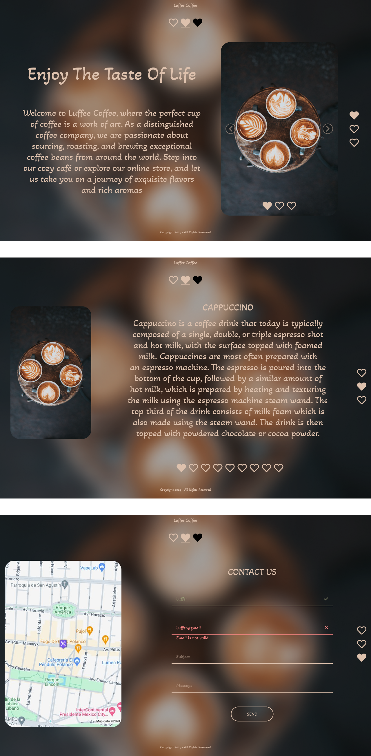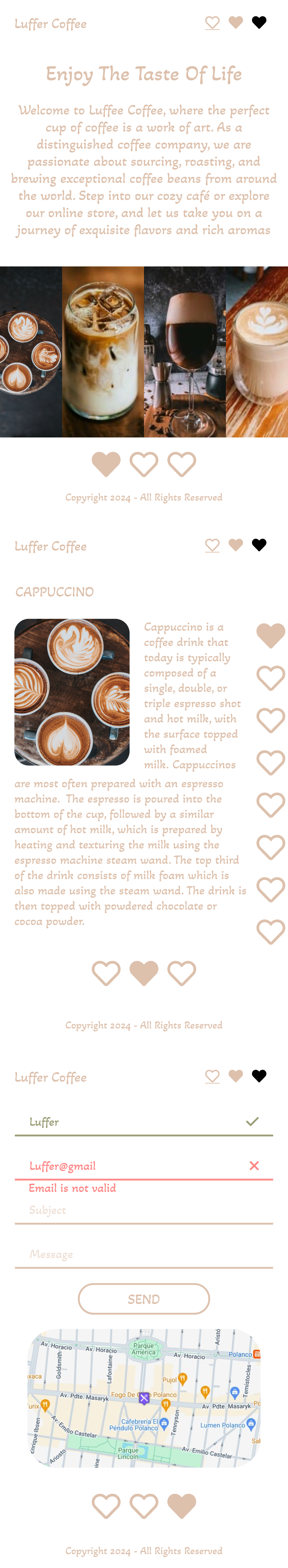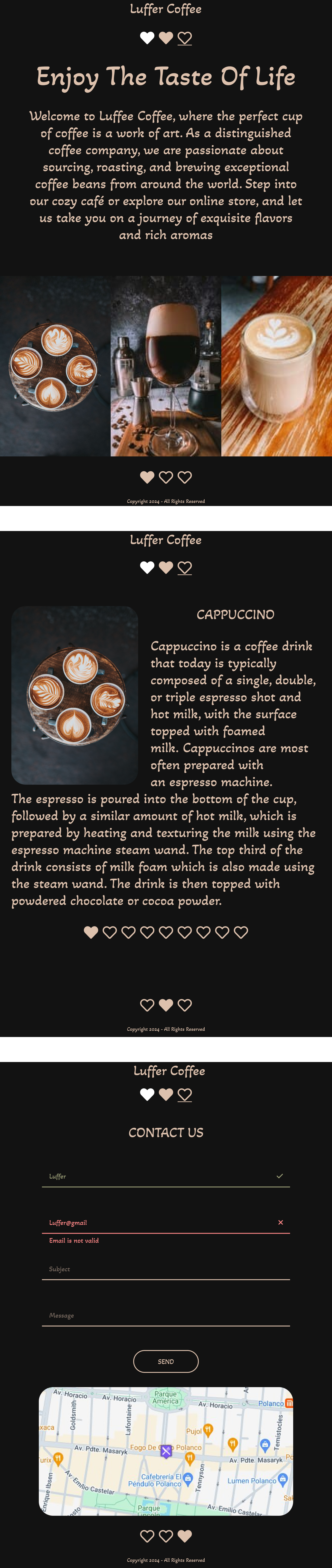 Luffer Coffee is a portfolio website representing a coffee shop. This website was made with Hugo, it's a simple and minimalist SPA. The libraries used are mainly EmblaCarousel, JustValidate, SweetAlert, GSAP, and LufferCarousel (my own library 😊).